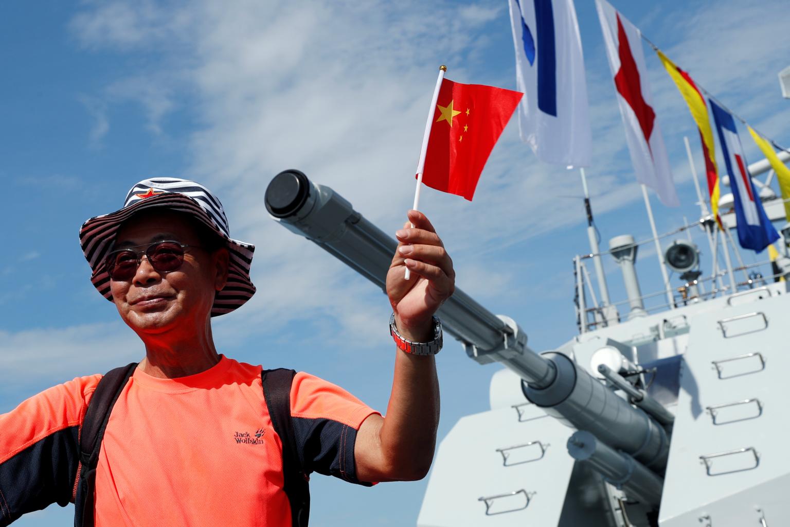 In a photo taken on June 30, 2019, a visitor holds a Chinese national flag as he poses for a photo on the deck of navy ship. The Chinese shipbuilder did not provide details about the ship's specifications, or its construction and delivery schedule to Thailand.