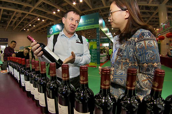 A merchant presents wines to visitors during the 10th Yantai International Wine Exposition in Yantai, East China's Shandong province.