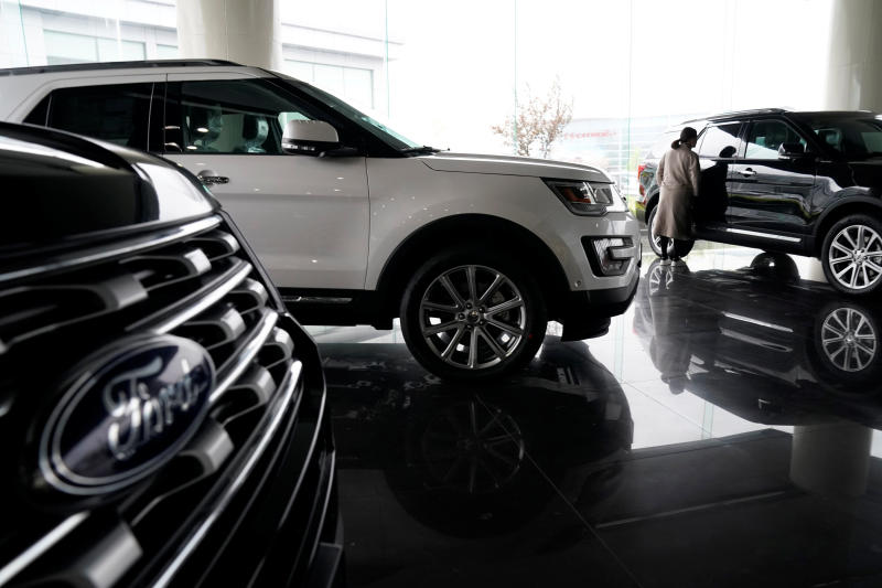 A woman looks at Ford cars at a dealer shop in Shanghai, China, on April 5, 2018.
