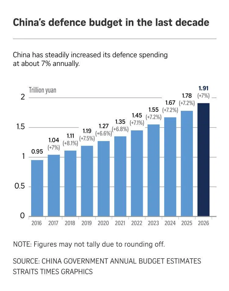 He told The Straits Times that a 0.2 percentage point decline in defence budget growth in 2026 compared with 2025 could reflect an adjustment to China’s declining economic growth.