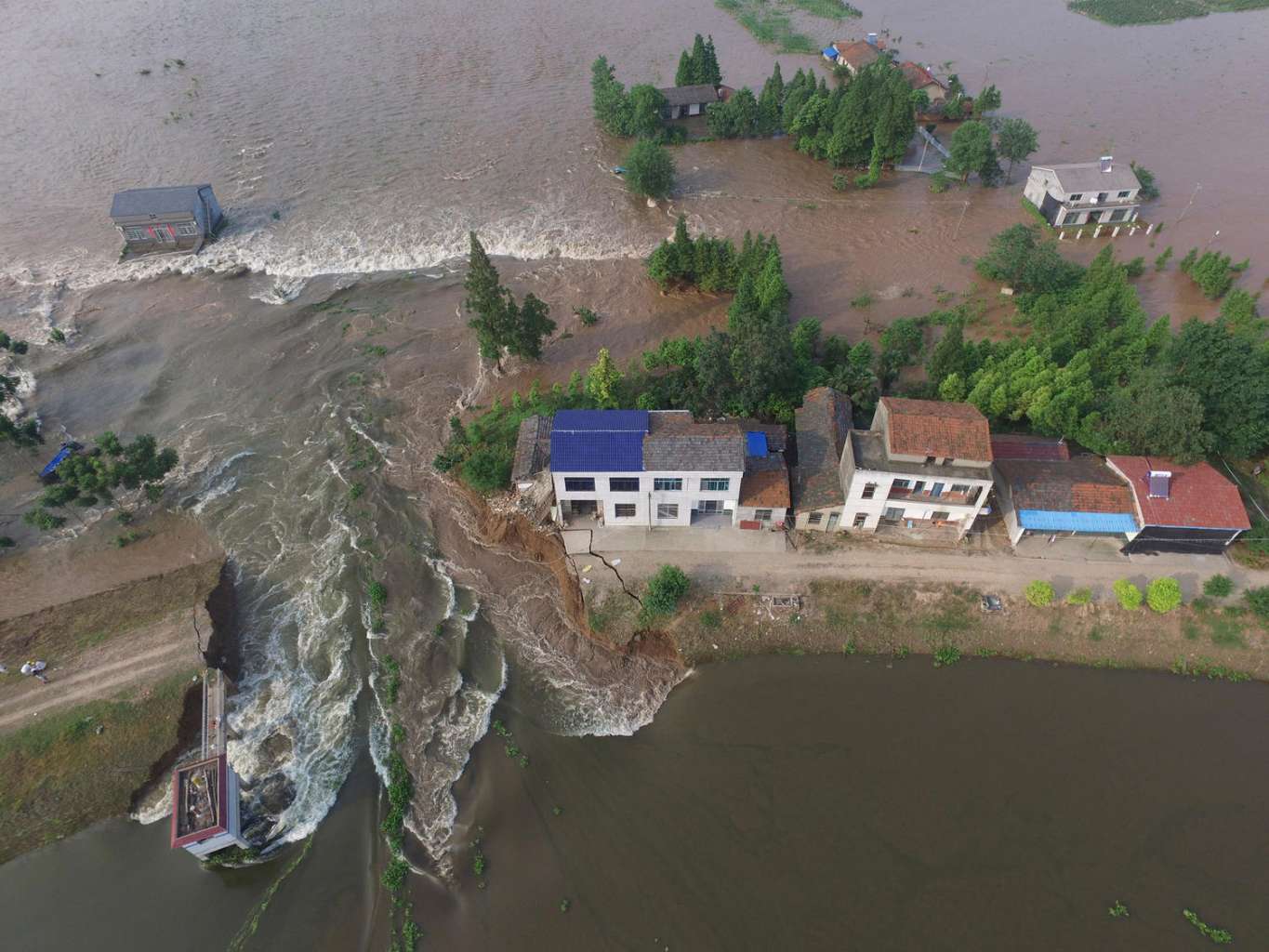 Houses are flooded as a dike breaches in Huarong County, Hunan Province on July 10, 2016.