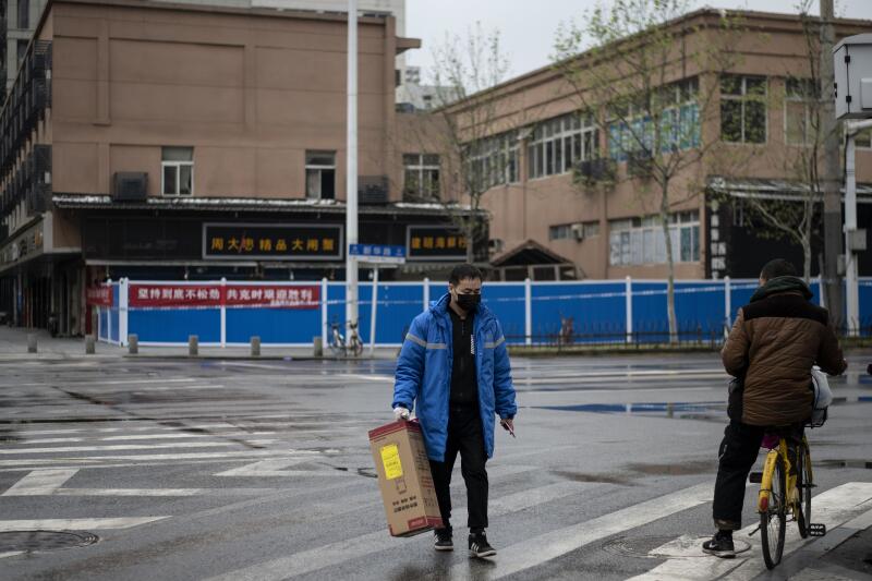 A man wearing a face mask walks near the Huanan Seafood Wholesale Market in Wuhan in China's central Hubei province, on March 31, 2020.