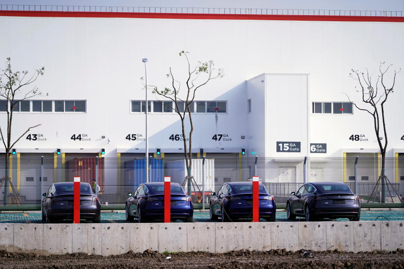 China-made Tesla Model 3 electric vehicles are seen at the Tesla Gigafactory in Shanghai on Dec 2, 2019.