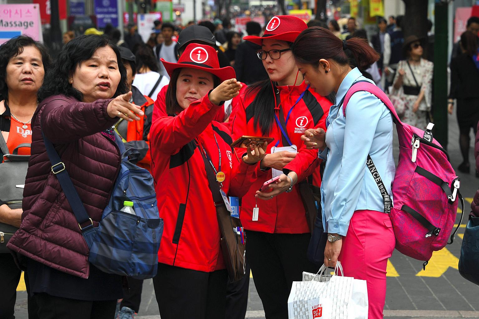 South Korean tourist information helpers guide tourists in the popular Myeongdong shopping district in Seoul.