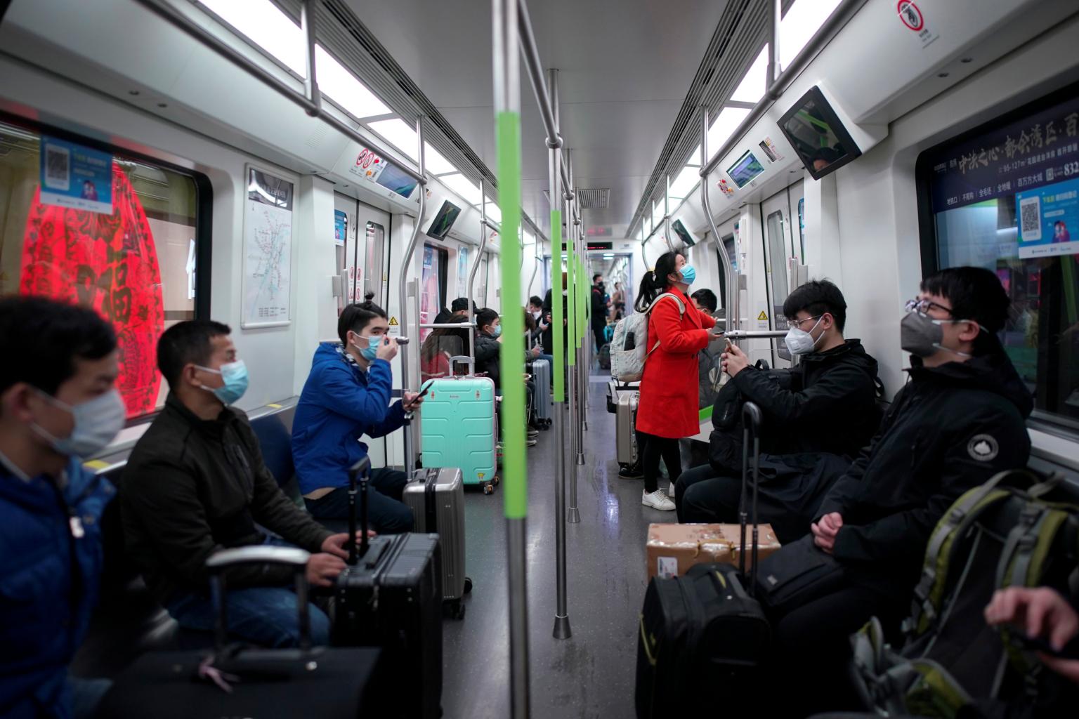 Passengers wearing face masks ride a subway train on the first day the city's subway services resumed in Wuhan on March 28, 2020.