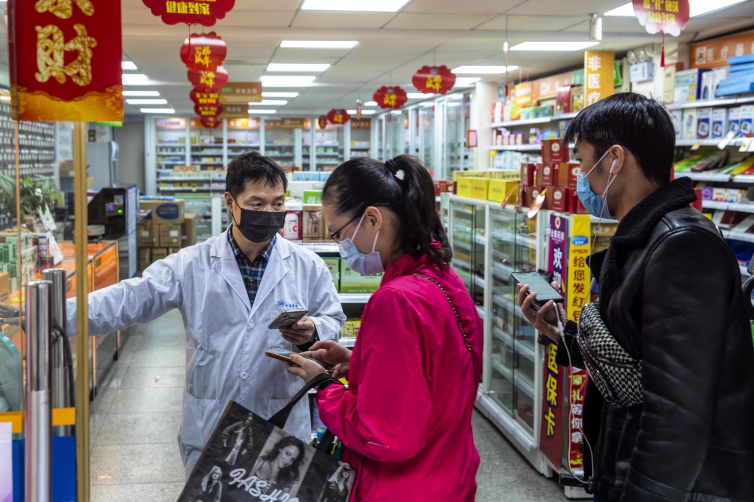 People form a queue in a pharmacy in Guangzhou, Guangdong, on Feb 11, 2020.