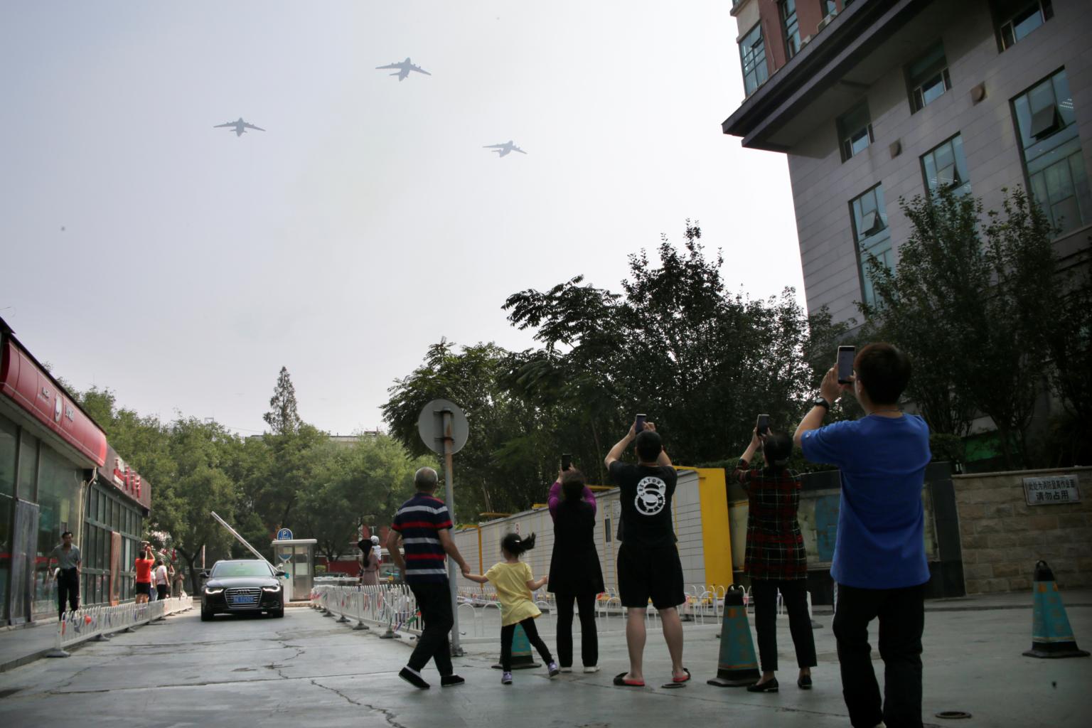 Residents record videos as planes from the Chinese People's Liberation Army air force fly during a rehearsal of the military parade to mark the 70th anniversary of the founding of the People's Republic of China, on Sept 22, 2019.