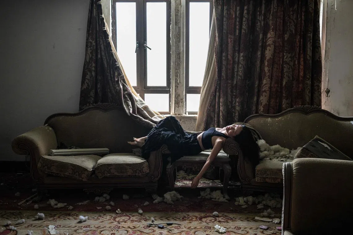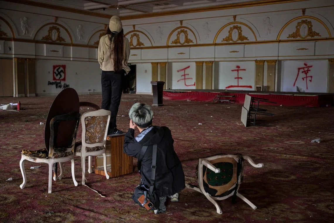 Mr Xu Pengcheng (left) taking pictures of model Mao Yi as she poses on a table in a room inside an abandoned hotel in Shanghai on May 24.