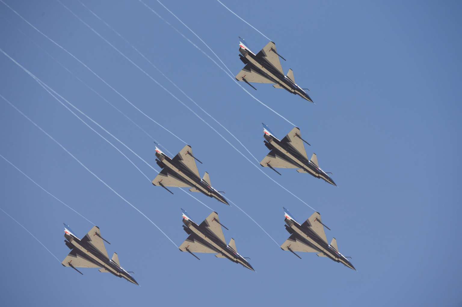 This picture taken on Sept 12, 2015 shows the People's Liberation Army (PLA) Air Force J-10 fighters performing at the Dafangshen airport in Changchun during the bi-annual Changchun airshow. PHOTO: AFP