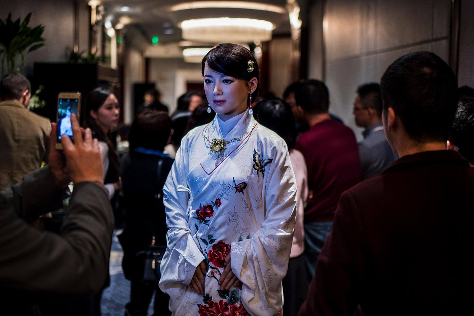 With flowing black hair and dressed in a traditional Chinese dress, Jia Jia looks strikingly real. Yet her charm has its limits and simple questions frequently stump her.