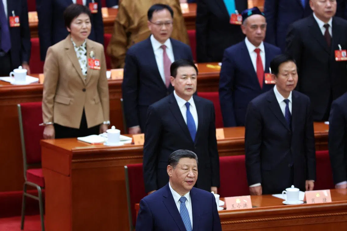 Inside, delegates including President Xi Jinping and his top brass stood to sing a rendition of China’s national anthem.