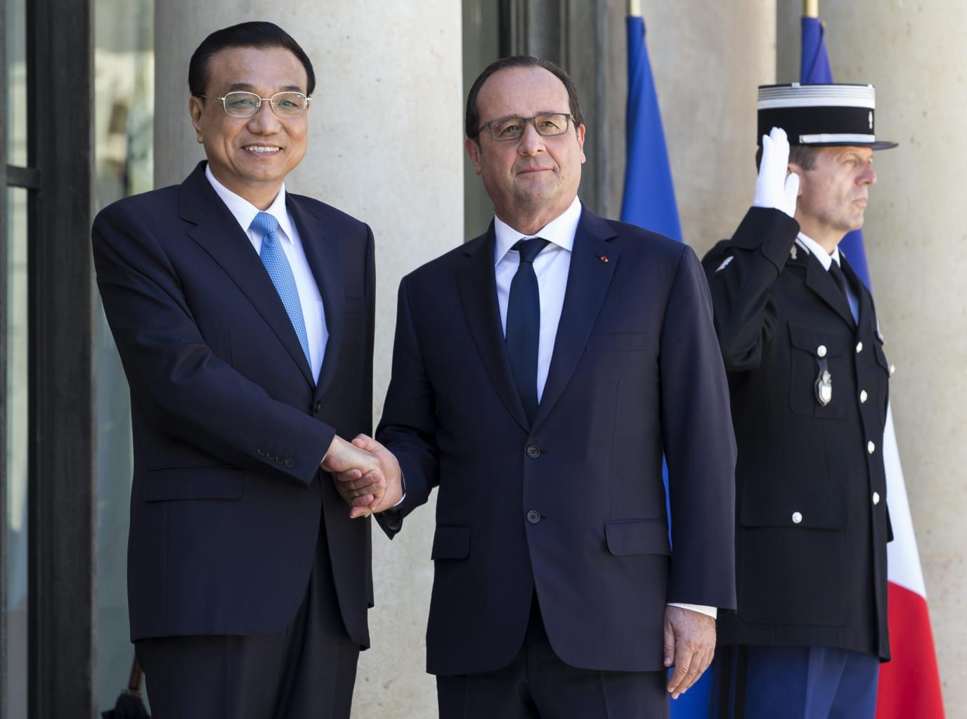 French President Francois Hollande (right) greets Chinese Prime Minister Li Keqiang as he arrives for a meeting at the Elysee Palace in Paris, France on June 30, 2015.