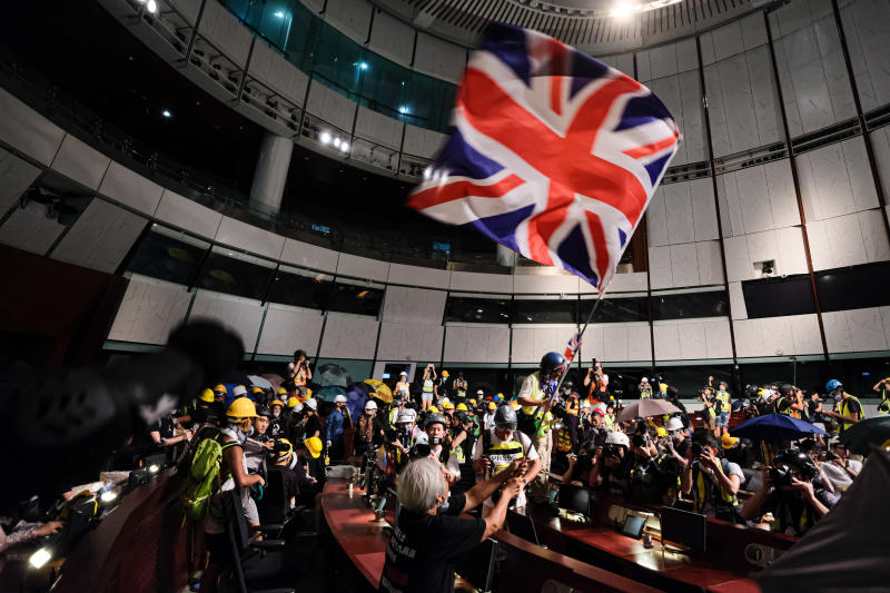 A protester waves the Union Jack flag inside the Legislative Council building during a demonstration against the Chinese government on July 1, 2019.