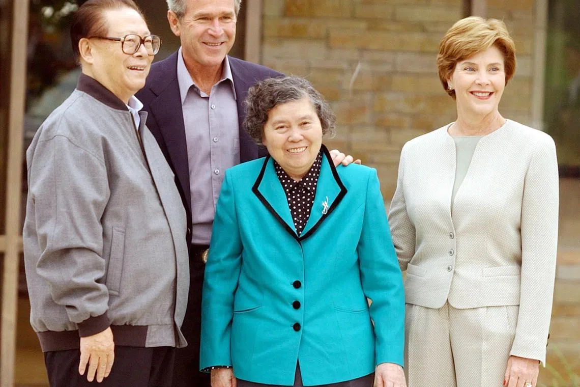 A 2002 photo shows presidents Jiang Zemin and George W. Bush, with their wives, Wang Yeping and Laura Bush, outside Mr Bush’s ranch in Crawford, Texas.