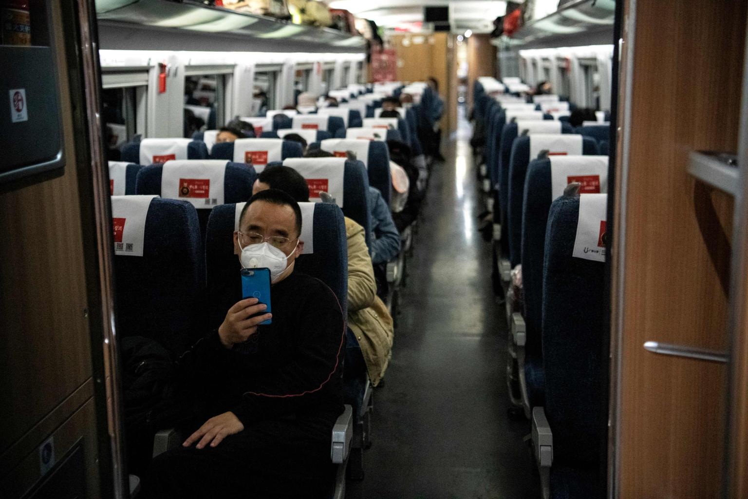 A passenger uses his mobile phone as the train stops at Wuhan railway station on March 4, 2020.