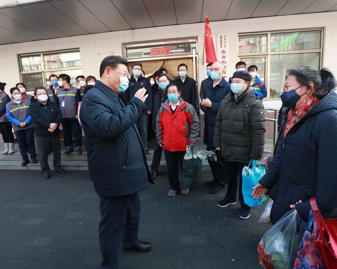 Chinese President Xi Jinping (left) meeting local residents during an inspection of the novel coronavirus pneumonia prevention and control work at the Anhuali Community in Beijing, on Feb 10, 2020.