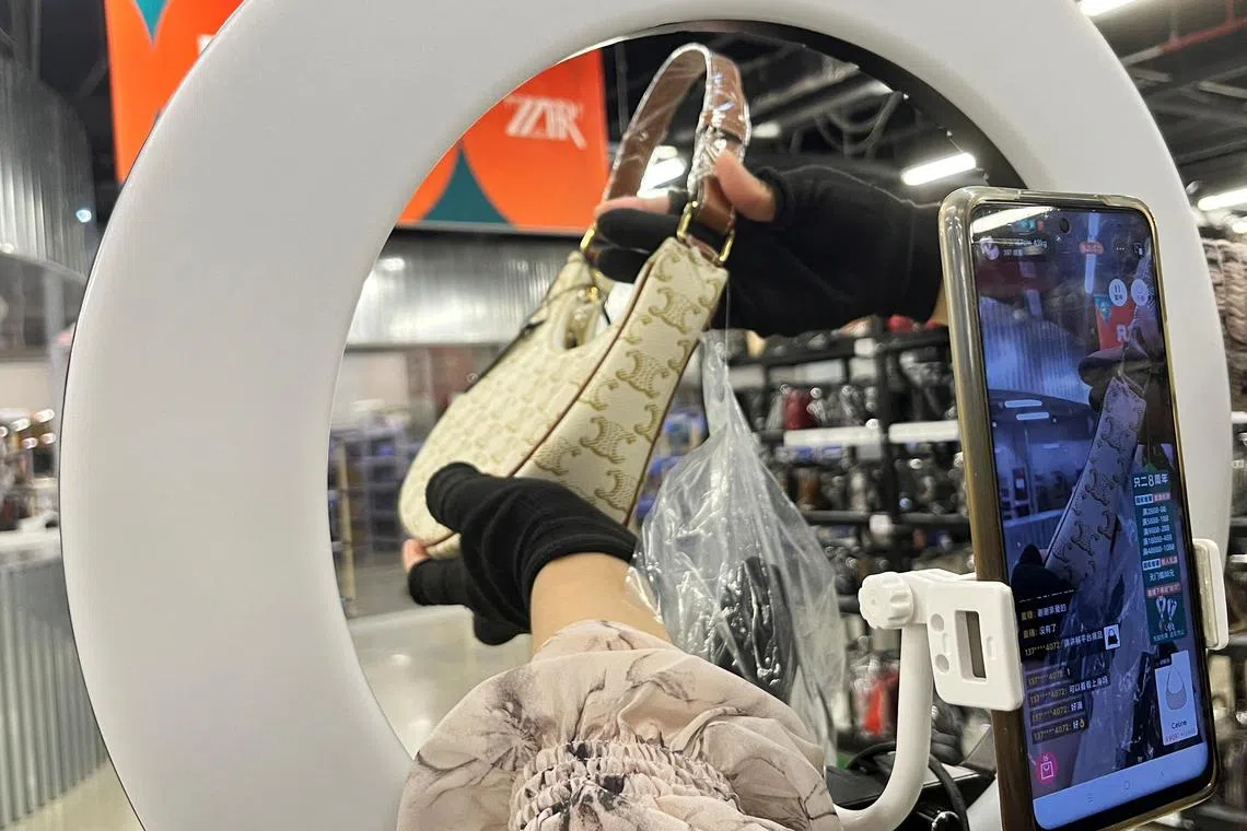 A host promotes a bag during a live-streaming session at a warehouse of second-hand luxury e-commerce platform ZZER in Shanghai.
