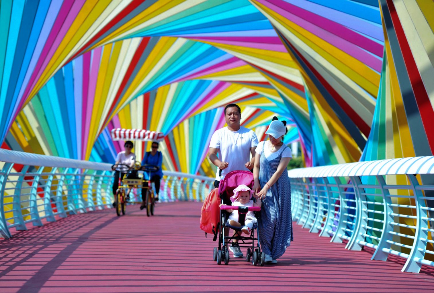 People walk on a bridge in Qingdao, Shandong province. China's population shrank last year for the first time in recent decades, researchers said.