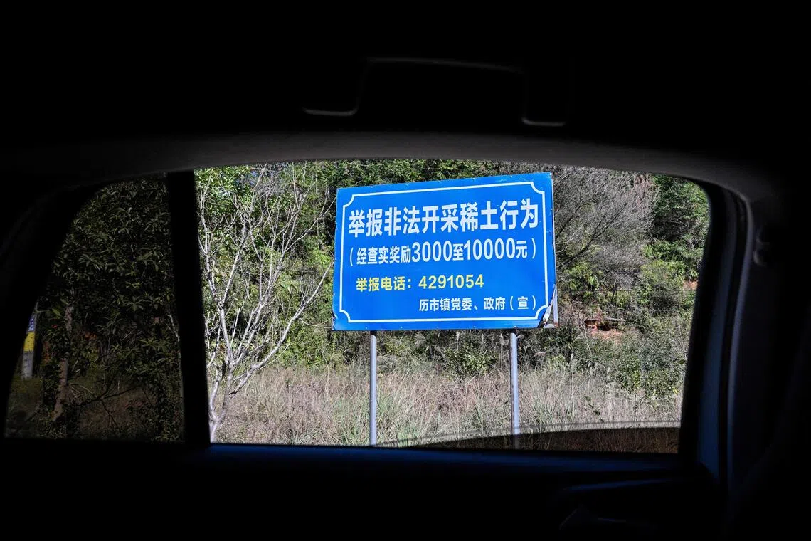 A sign announcing a reward for those who report illegal rare earth mining activities Ganzhou, in eastern China’s Jiangxi province, on Nov 20.