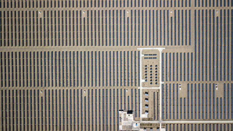 Photovoltaic panels stand at a solar power station at the Golmud Solar Park in this aerial photograph taken on the outskirts of Golmud, Qinghai province, China, on July 24, 2018.