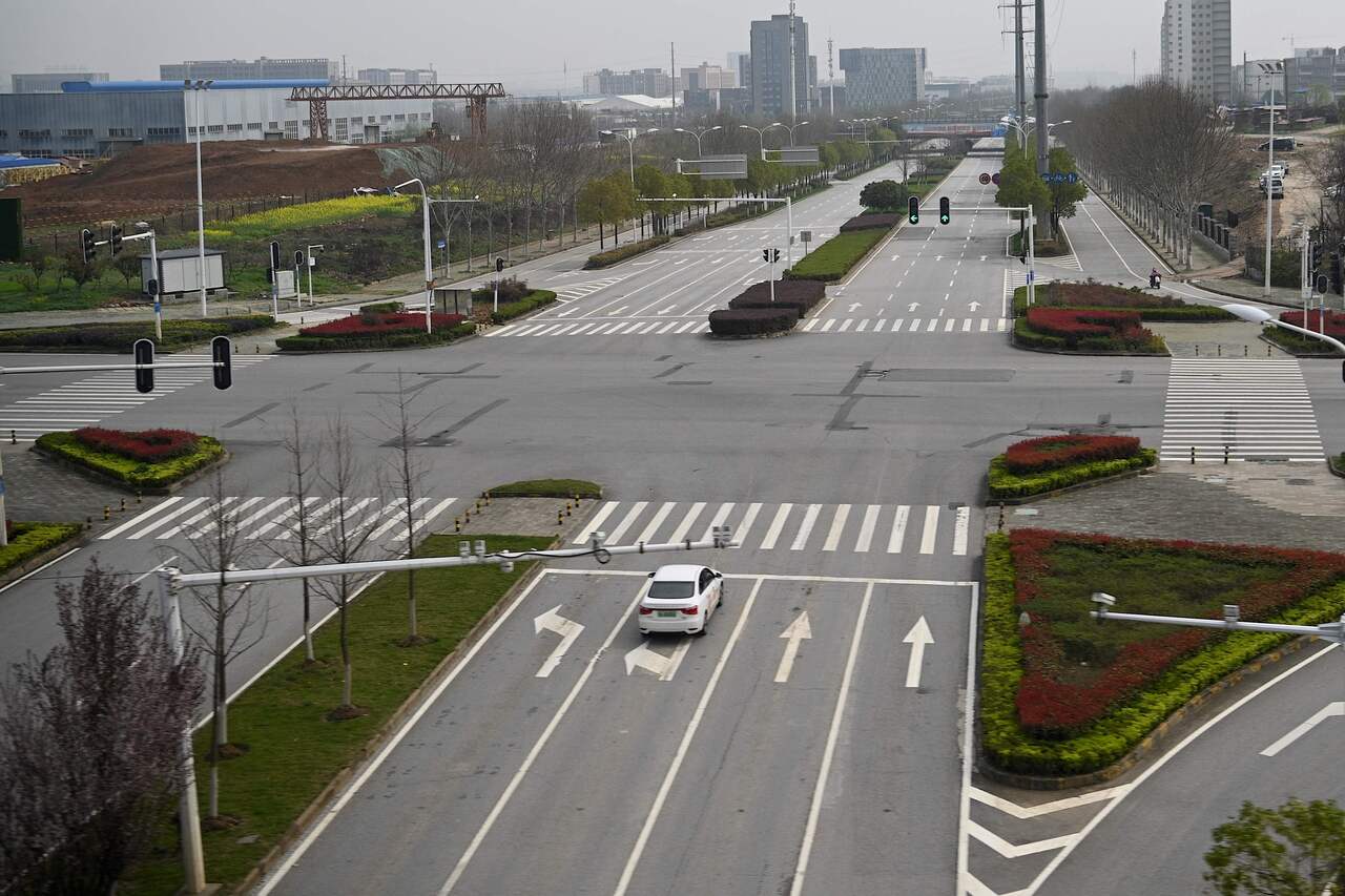 A car waits for the red light to change at an intersection in Wuhan on March 10, 2020.