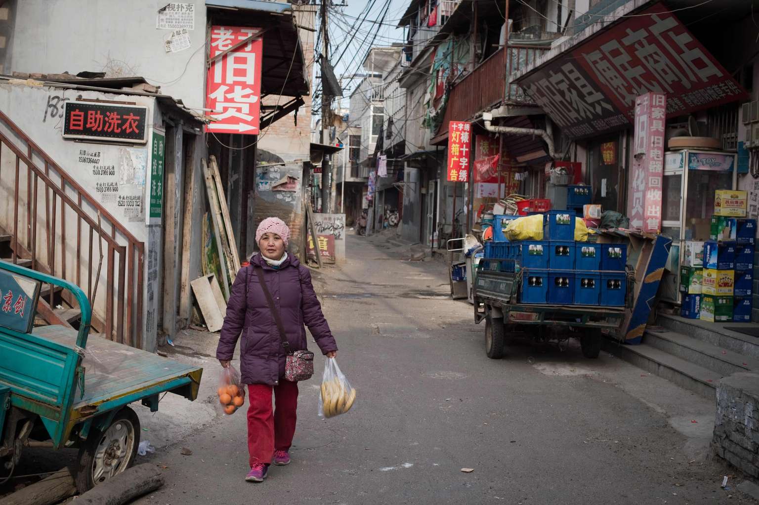 A woman walks on a street with her groceries in Beijing on Jan 18, 2017.