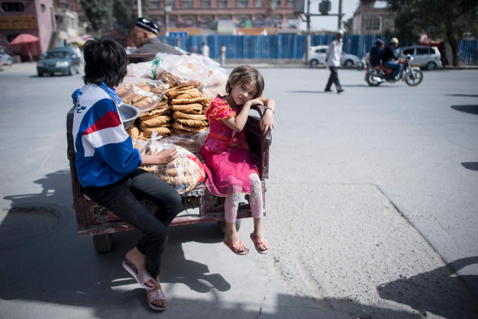 Children riding on the back of a tricycle of a Muslim sweet vendor in Yarkand, in China's Xinjiang Uighur Autonomus Region.