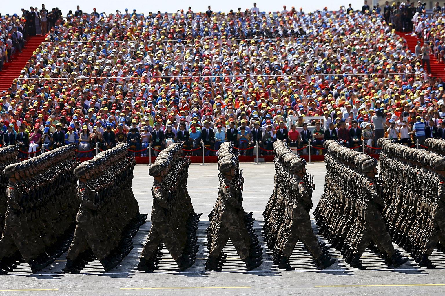People's Liberation Army soldiers marching in a parade to mark the 70th anniversary of the end of World War Two, in Beijing, on Sept 3, 2015.