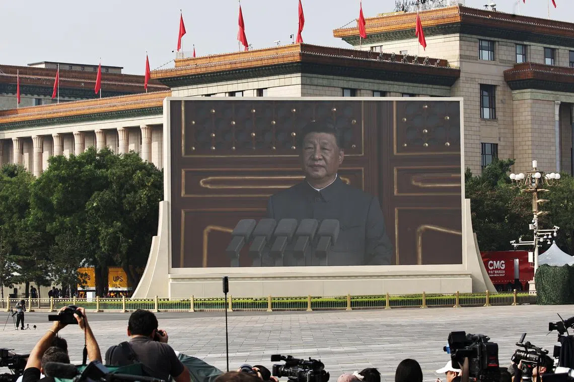 A screen shows Chinese President Xi Jinping speaking during a military parade in Beijing’s Tiananmen Square on Sept 3.