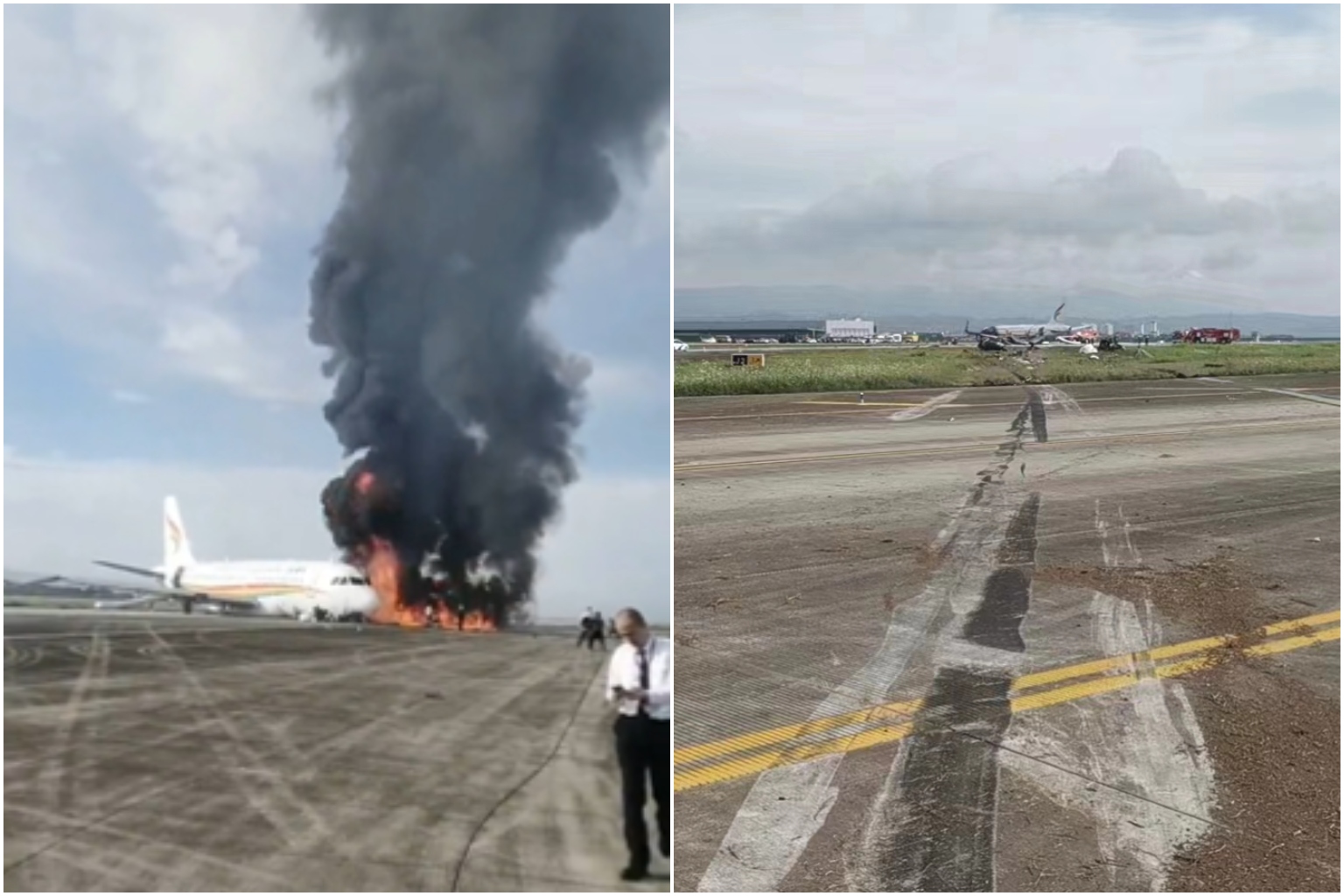Unverified video on social media showed a Tibet Airlines plane, a subsidiary of Air China, with heavy smoke and flames pouring from the left side of the aircraft as passengers and crew walked away.