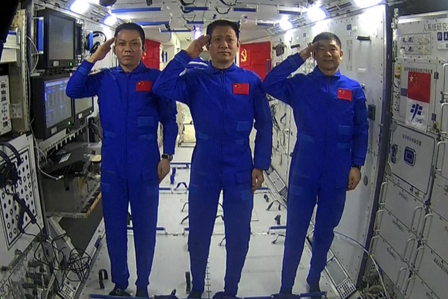(From left) Chinese astronauts Tang Hongbo, Nie Haisheng and Liu Boming saluting from the Chinese space station core module Tianhe on June 23, 2021.