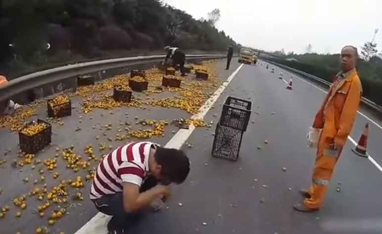 The driver wept by the road as villagers scrambled to pick the oranges off the road in Yichun, Jiangxi province, news portal Kankannews.com reported.
