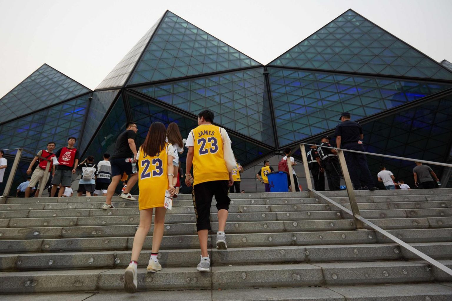 Fans wearing LeBron James shirts arrive to watch the National Basketball Association (NBA) pre-season game between the Los Angeles Lakers and Brooklyn Nets in Shenzhen, in China's southern Guangdong province on Oct 12, 2019.