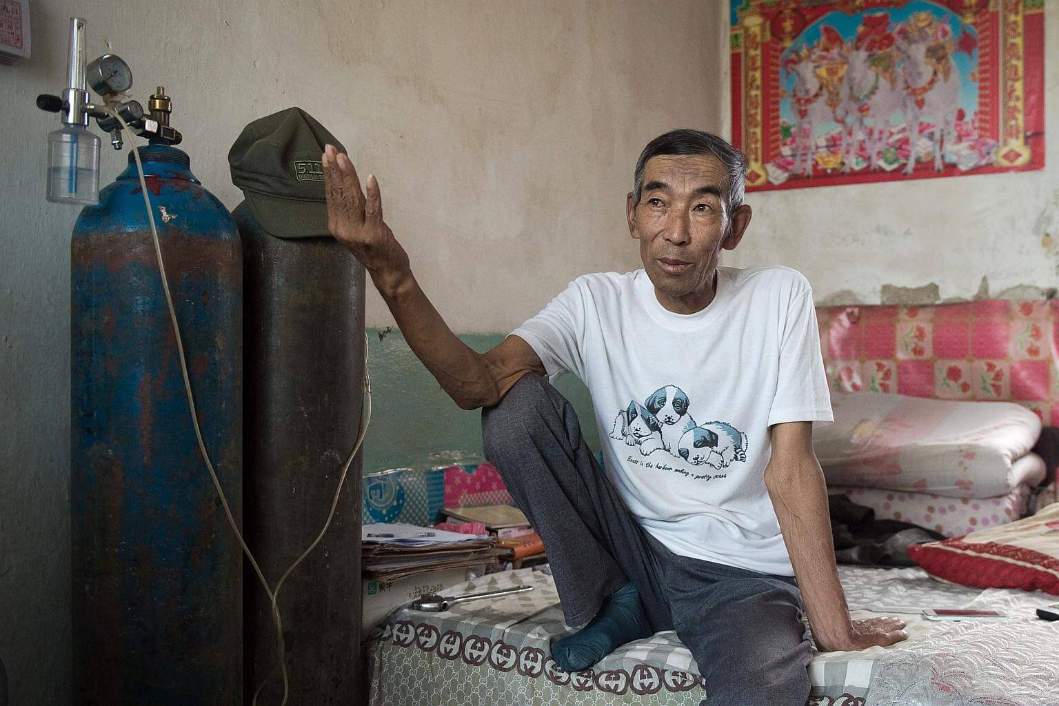 Farmer Wang Enlin sits in his room inside his house in Yushutun.