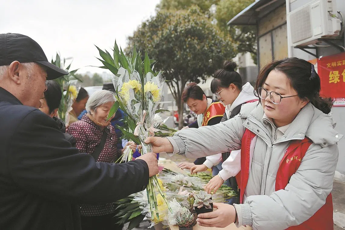 Volunteers distribute flowers as they promote more “low-carbon” and “civilised” tomb sweeping practices in Hefei, Anhui province.