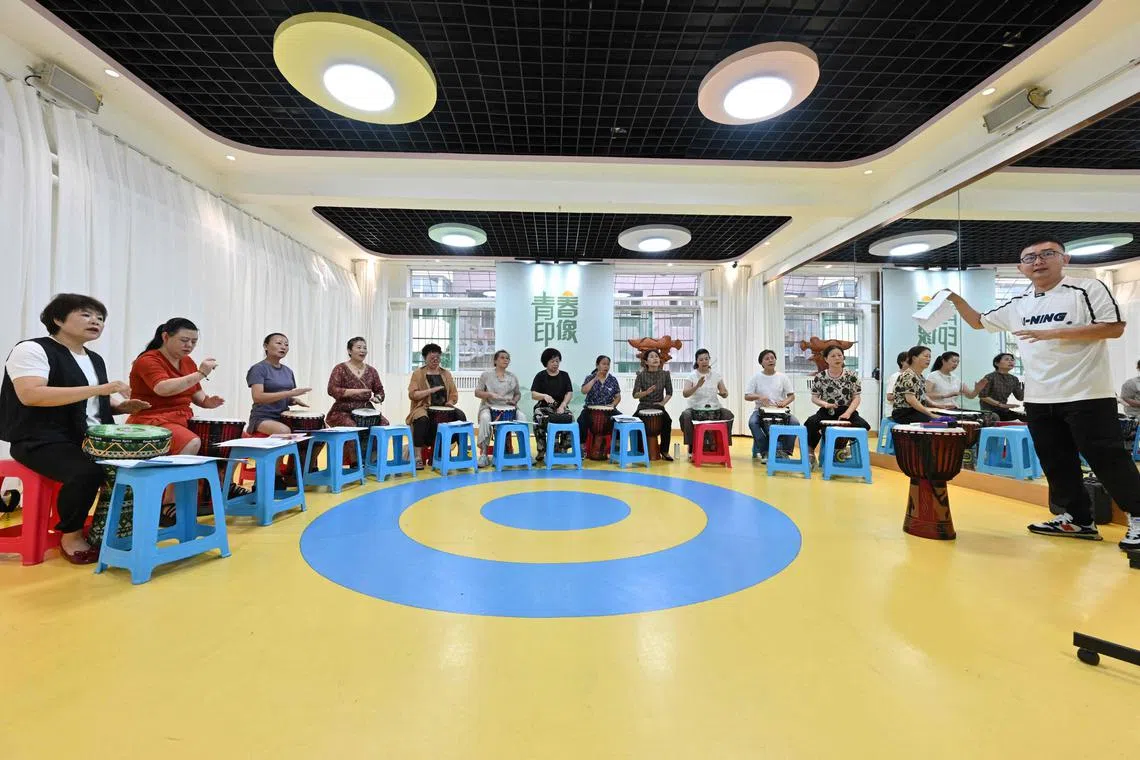 Mr Lei Fangyan (right) teaching African drums at a kindergarten-turned-elderly centre in Taiyuan, in China’s northern Shanxi province.