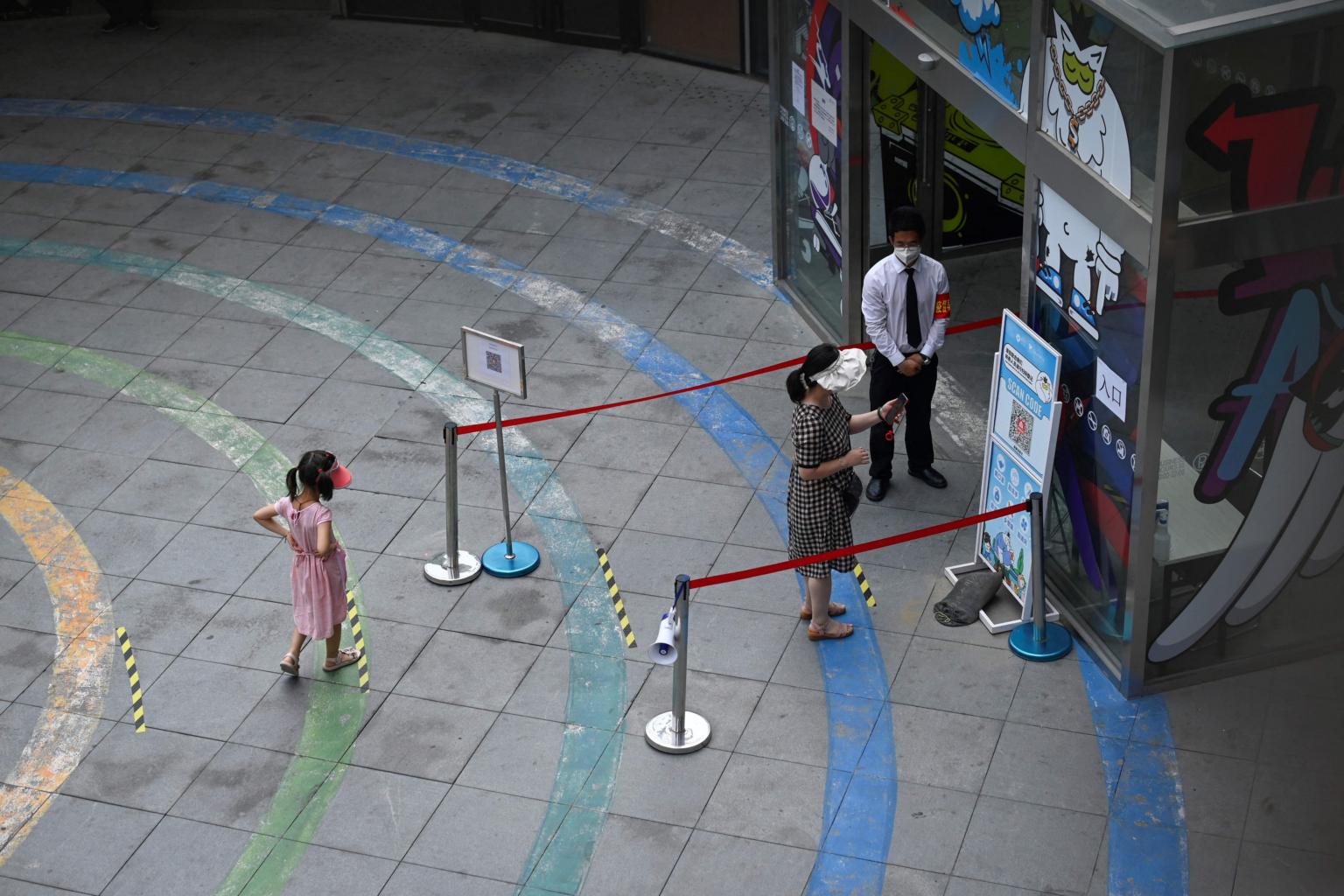 A woman uses her phone to scan the health code at the entrance of a mall in Beijing on June 20, 2022.
