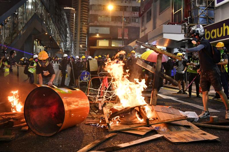 Demonstrators burn wood and cardboard during a protest on Aug 4. The past fortnight has seen a surge in violence on both sides, with Hong Kong police firing rubber bullets and tear gas to disperse increasingly hostile projectile-throwing crowds.