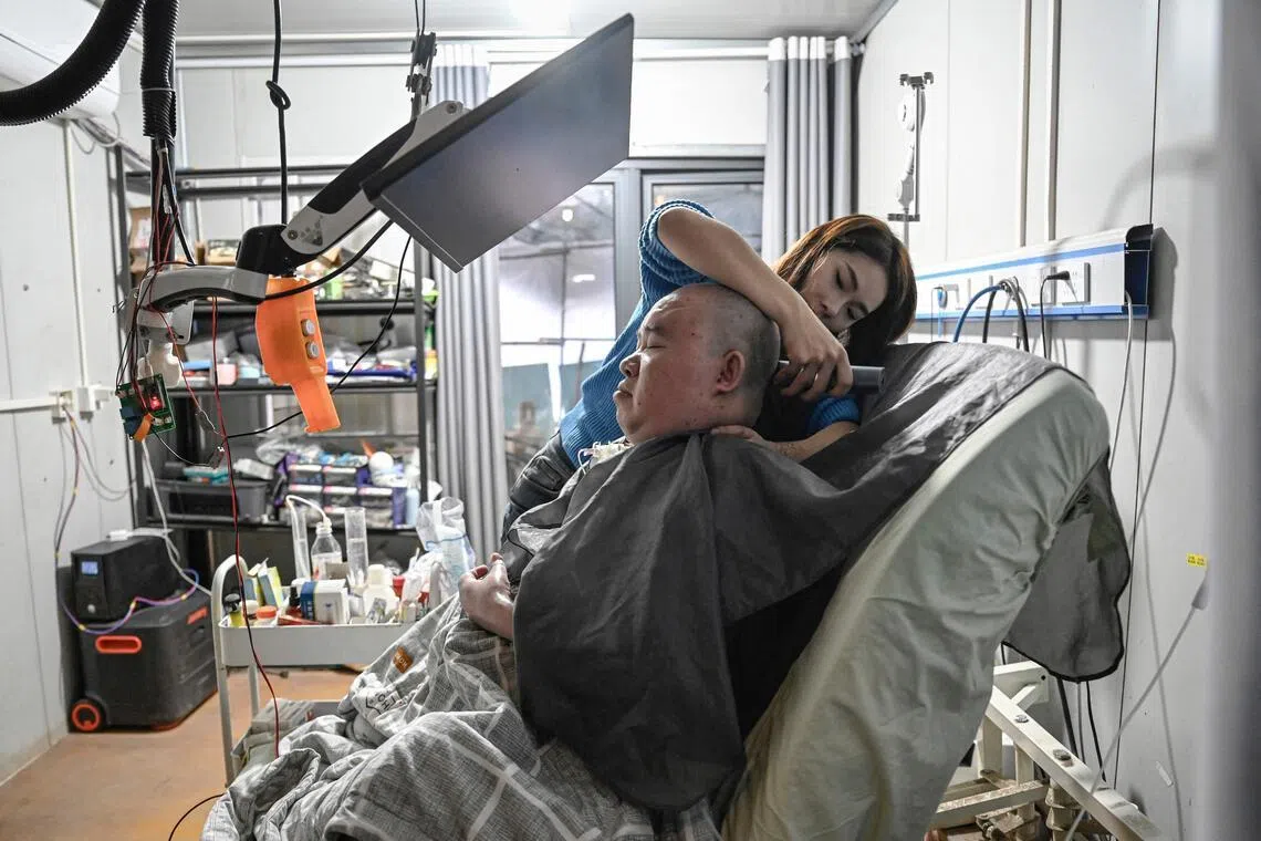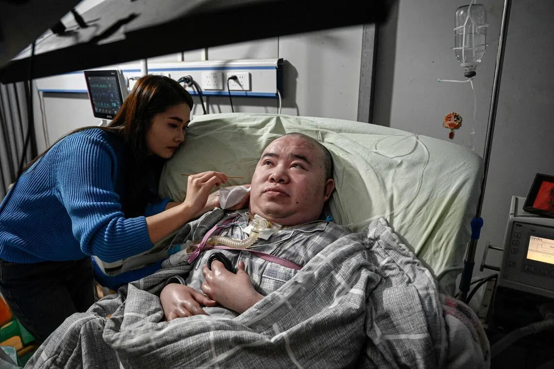 Ms Li Qian (left), taking care of her elder brother Li Xia who has Duchenne muscular dystrophy, at their house in south-western China's Chongqing municipality.