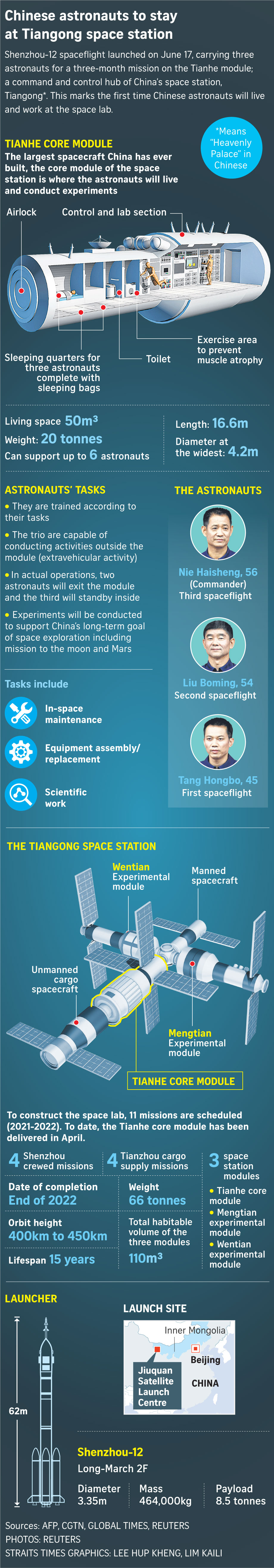 JIUQUAN, CHINA (REUTERS, AFP, XINHUA) - Three Chinese astronauts on Thursday (June 17) flew to an unfinished space station in China's first crewed mission since 2016, expanding the country's already growing near-Earth presence and challenging US leadership in orbital space.