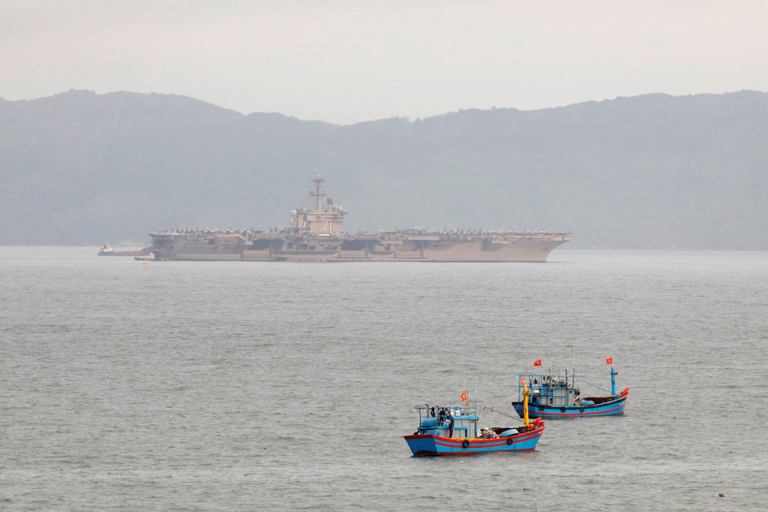 The USS Theodore Roosevelt (CVN-71) is seen near Vietnamese fishing boats at a port in Danang city, Vietnam, on March 6, 2020.