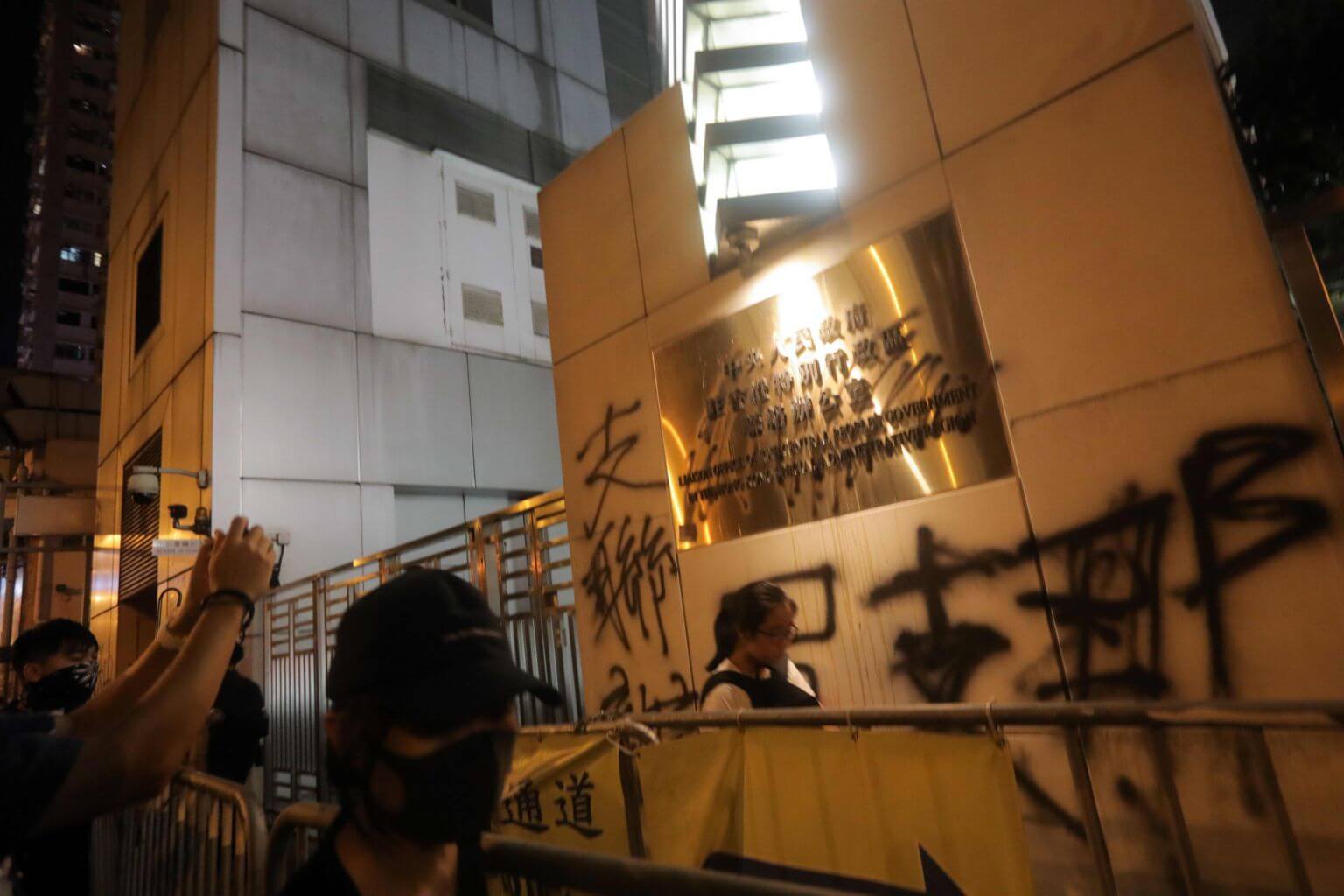Thousands of masked demonstrators briefly occupied the road outside Beijing's office on Sunday night, erected barricades and targeted the building with eggs, projectiles, laser lights and graffiti in a stark rebuke to Beijing's rule.