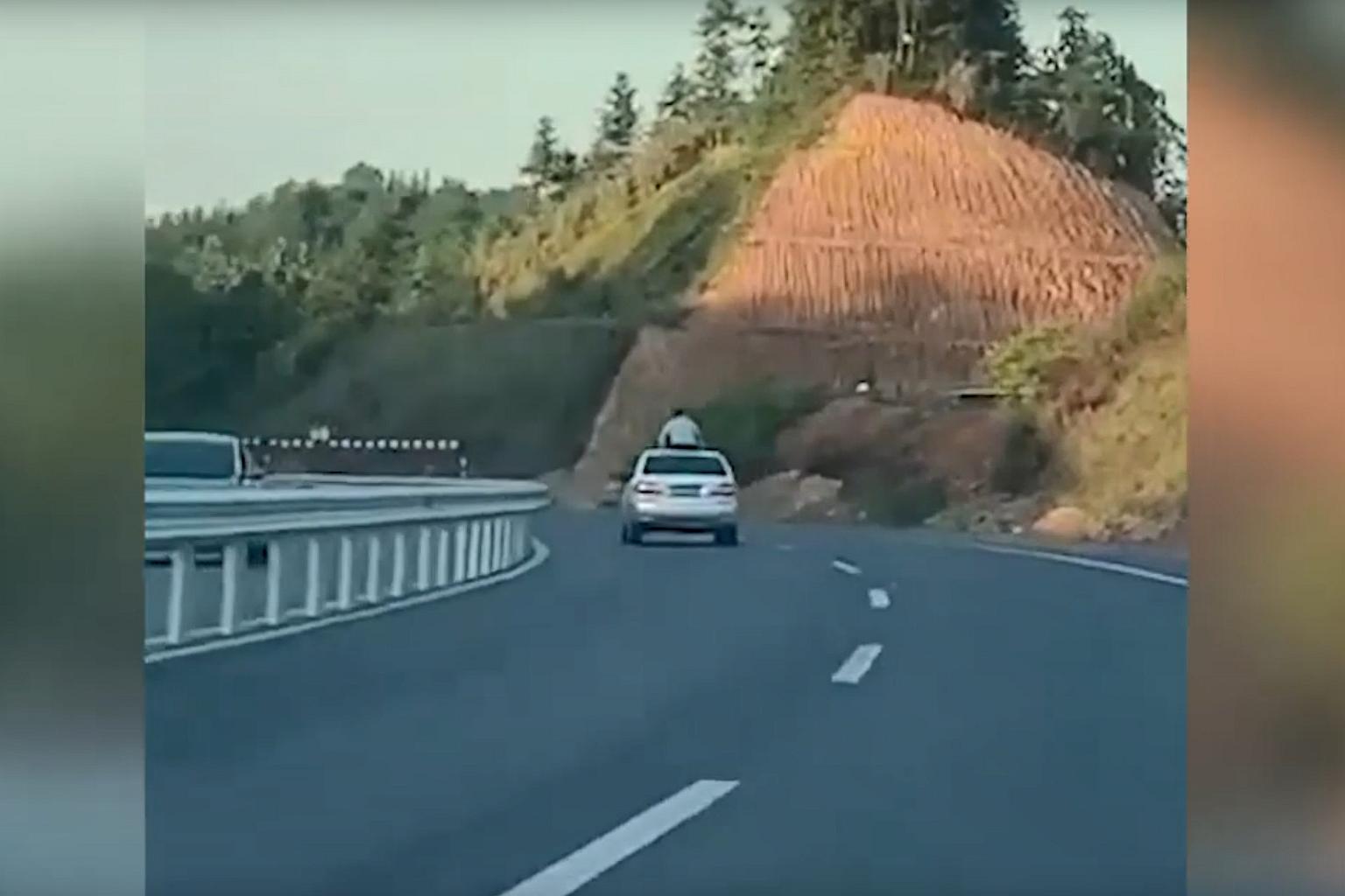 In the video, the boy can be seen with his upper body out of the sunroof as the car travels on the empty expressway.
