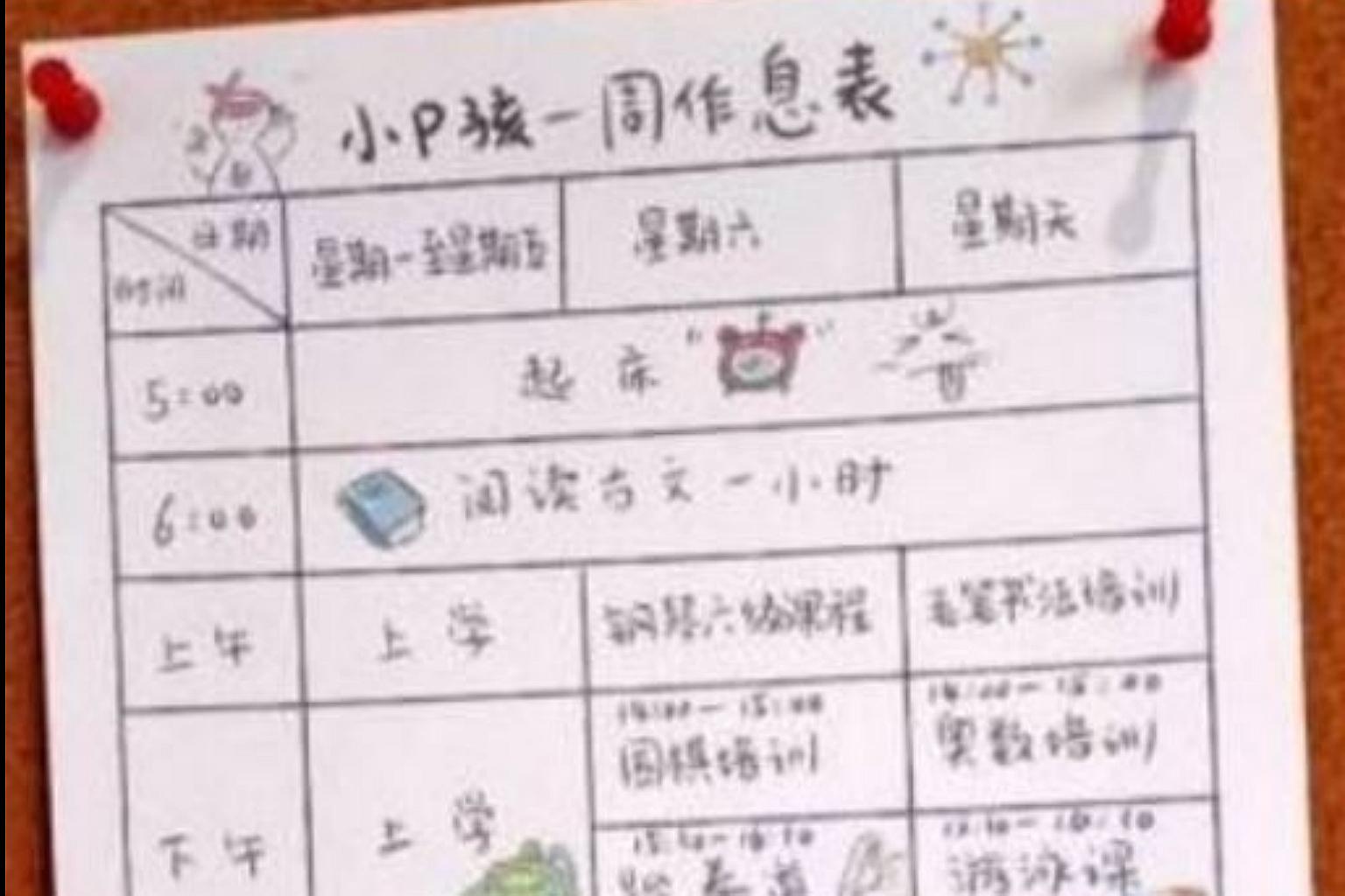 A typical weekday involves the boy taking additional English lessons on top of attending school and finishing his homework, while weekends are spent practising the piano or calligraphy, learning swimming and preparing for the International Mathematical Olympiad.