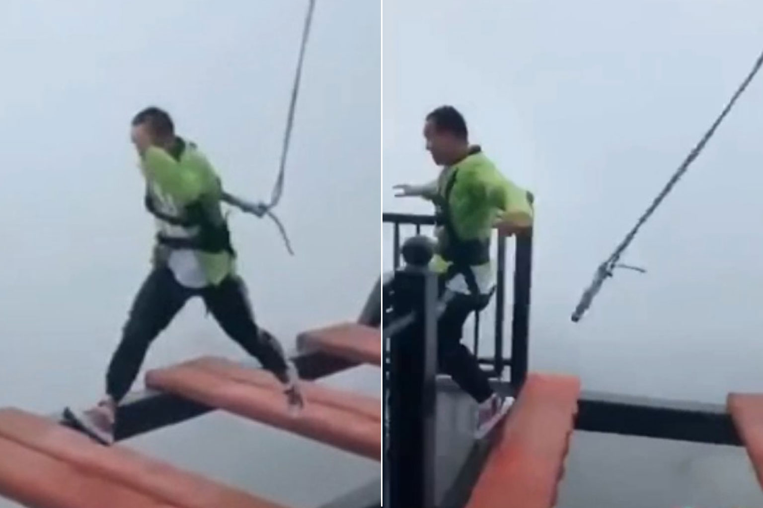 It was a lucky escape for one Chinese tourist, who had leapt to safety from a giant suspended walkway moments before his harness came loose.