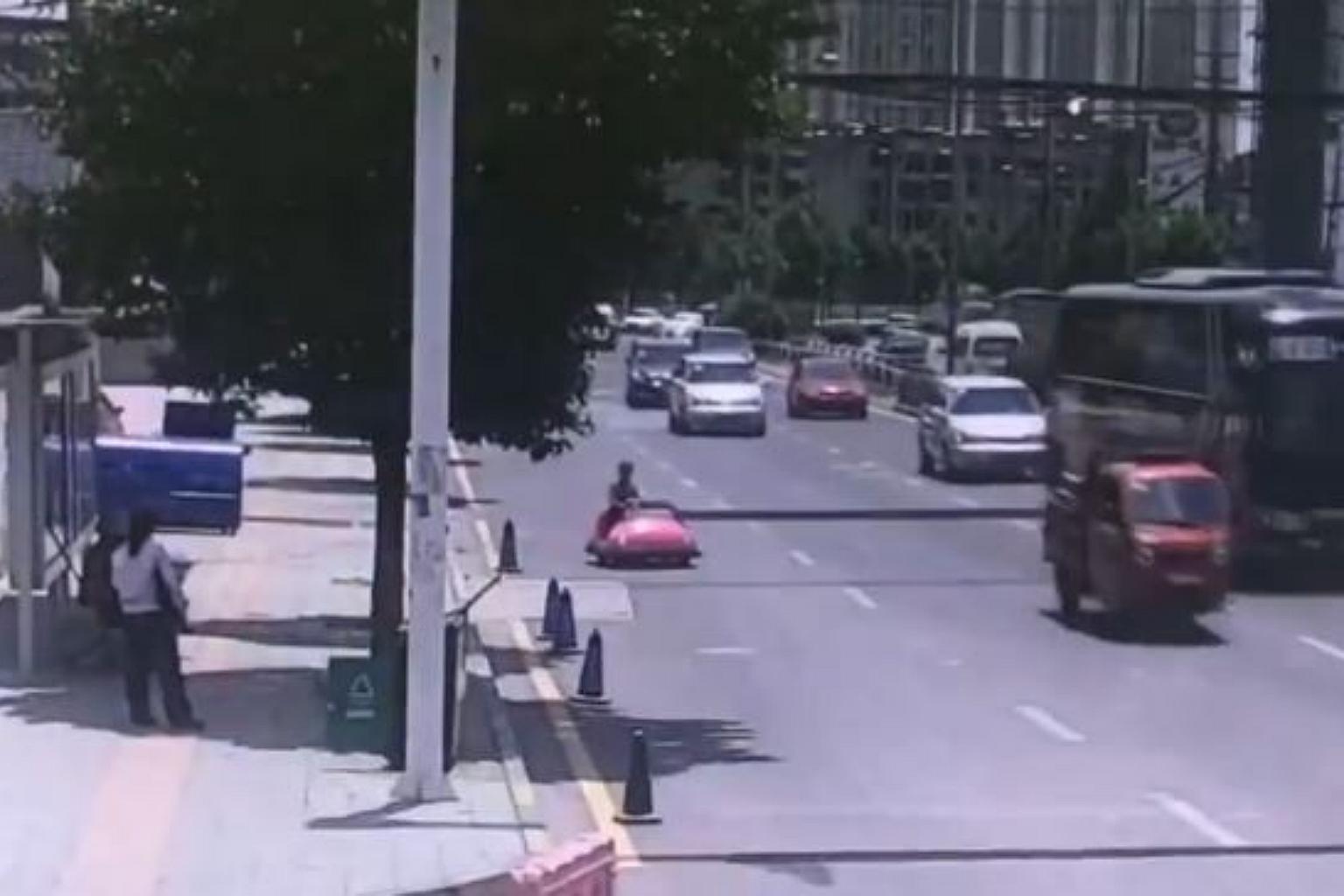 Chinese woman pulled over for driving pink bumper car through busy traffic in Guiyang