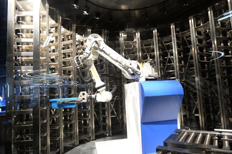 A robot arm transferring food at the "Robot.He" restaurant in Shanghai.