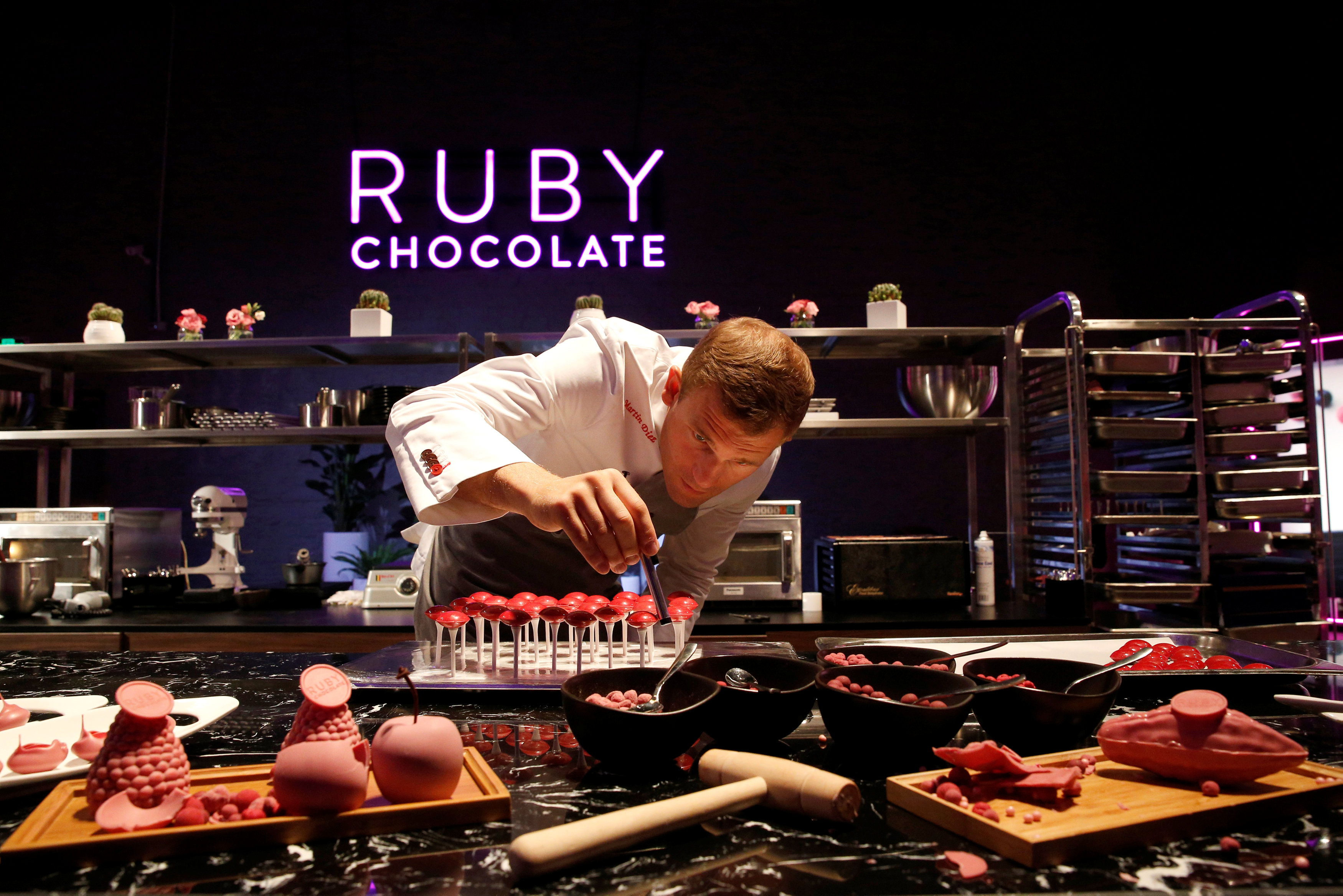 Ruby chocolates are displayed during a Ruby chocolate launch event held by chocolate maker Barry Callebaut, in Shanghai, China on Sept 5, 2017.