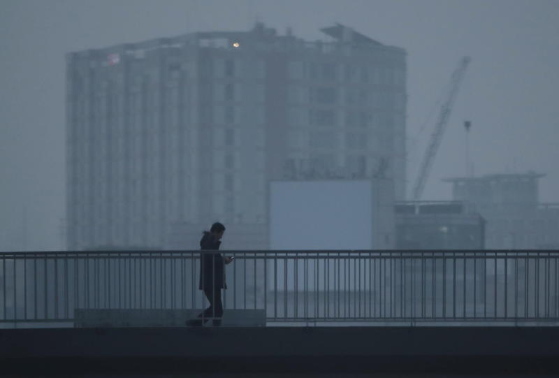 A pedestrian crosses an overpass through cloudy air from thick fine dust in Seoul, South Korea, on Jan 15, 2019. Emergency measures were in effect to minimise air pollution as the country combats dense haze.