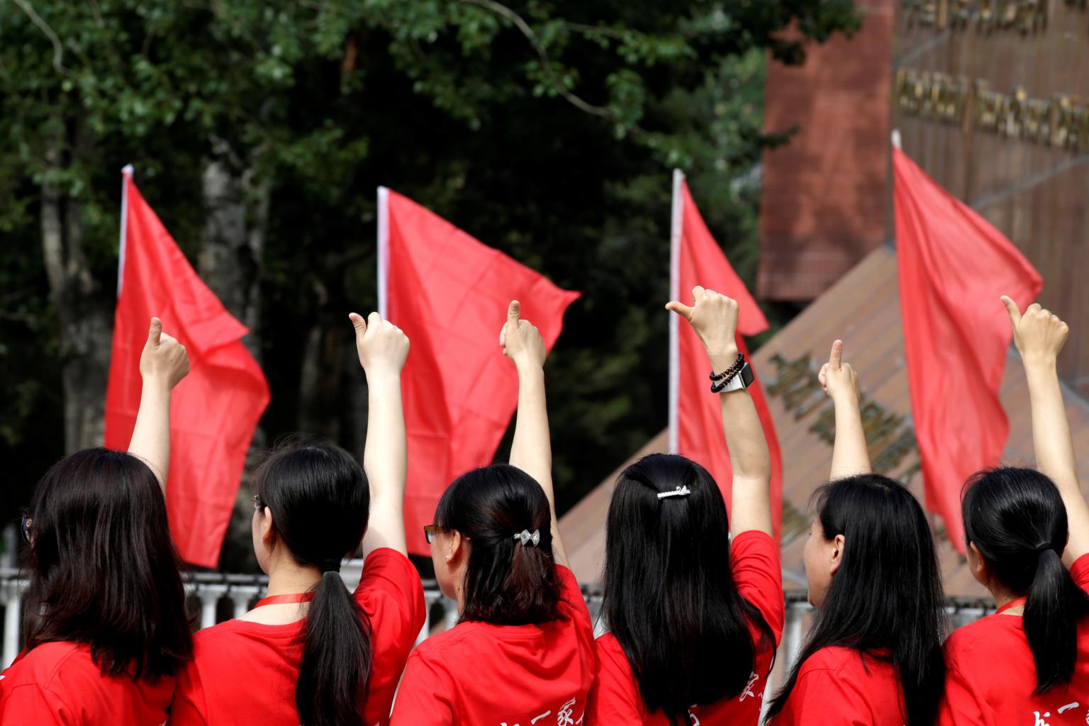 In a picture from on June 7, 2019, teachers cheer on the arrival of students at the High School affiliated to Renmin University of China for the first part of the country's annual national college entrance exam.